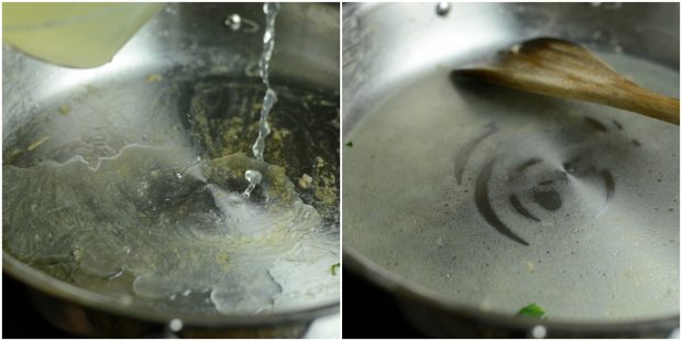 Pour 1/4 or so of the pasta water to the pan and scrape up any browned bits off of the bottom.