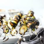Thread 5 to 6 of the prepped Brussels sprouts onto metal skewers. I keep the halved sprouts separate from the whole Brussels sprouts to ensure even grilling.