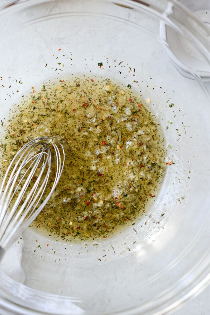 In a large mixing bowl, measure and add; 4 cloves grated fresh garlic (about 1 tablespoon), 1 teaspoon kosher salt, 3/4 teaspoon dried thyme, 1/2 teaspoon each dried oregano, dried parsley and freshly ground black pepper, 3/4 teaspoon garlic powder and 1/2 teaspoon onion powder. Lastly, measure and add in 1/4 teaspoon red pepper flakes – if using.